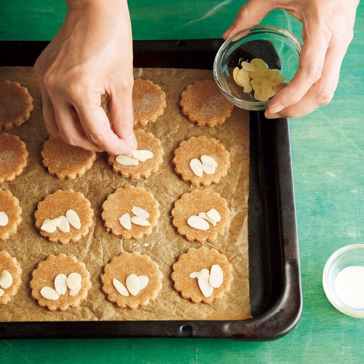 生地に豆乳を薄く塗り、アーモンドスライスをのせる。オーブンの下段に入れ、160℃で10分焼く。温度を150℃に下げてさらに10分焼き、取り出してさます。