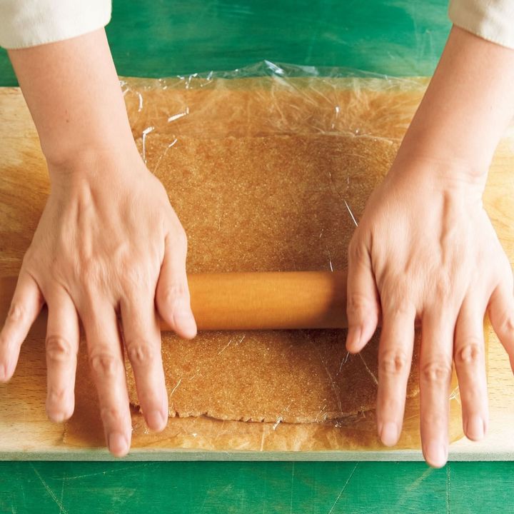まな板にラップを広げて生地を置き、さらにラップを重ねる。めん棒で厚さ5mm程度にのばす。型で抜き、下準備した天板に並べていく。残った生地も同様にする。型に生地がつきやすい場合は、全粒薄力粉適宜(分量外)を型につけてから抜くとよい。