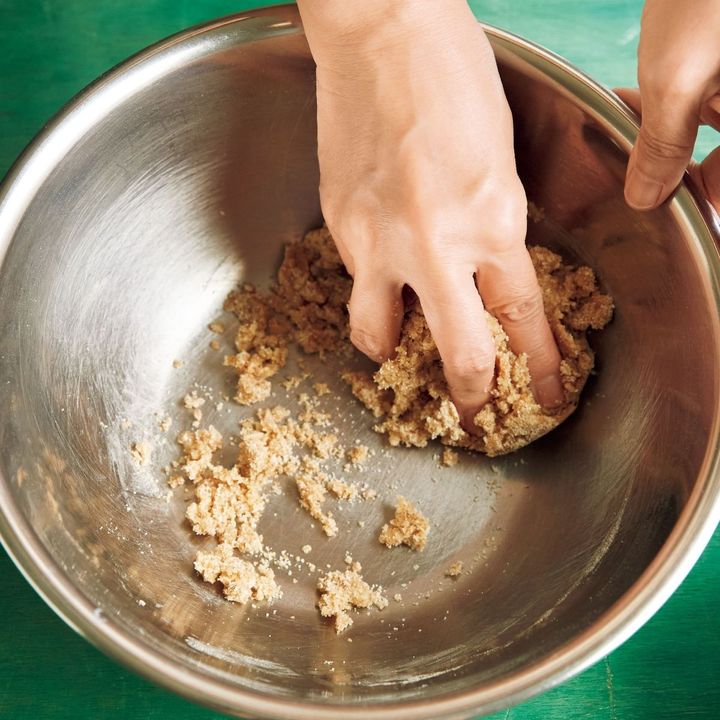 手で生地のかたまりを持ち、ボールの側面についた生地をぬぐいながら、握るようにひとまとめにしていく。ボールがきれいになり、手につかないくらいの堅さになればOK。まとまりにくい場合は、(1)で残しておいた液体を加える。
