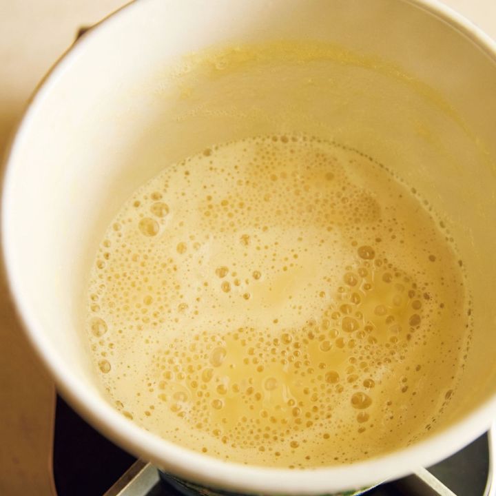 全体がキャラメル色になり、ゴムべらで鍋底をかくと、底がはっきり見えるくらいとろみがついたら火を止める。