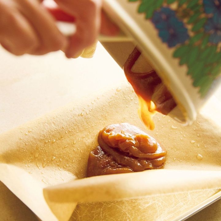 下準備したオーブン用シートに(2)をのせ、表面が乾かないようにまわりのシートでかるく包む。粗熱が取れたら、10×6cmに形を整え、再びかるく包んで冷蔵庫で2時間以上冷やす。