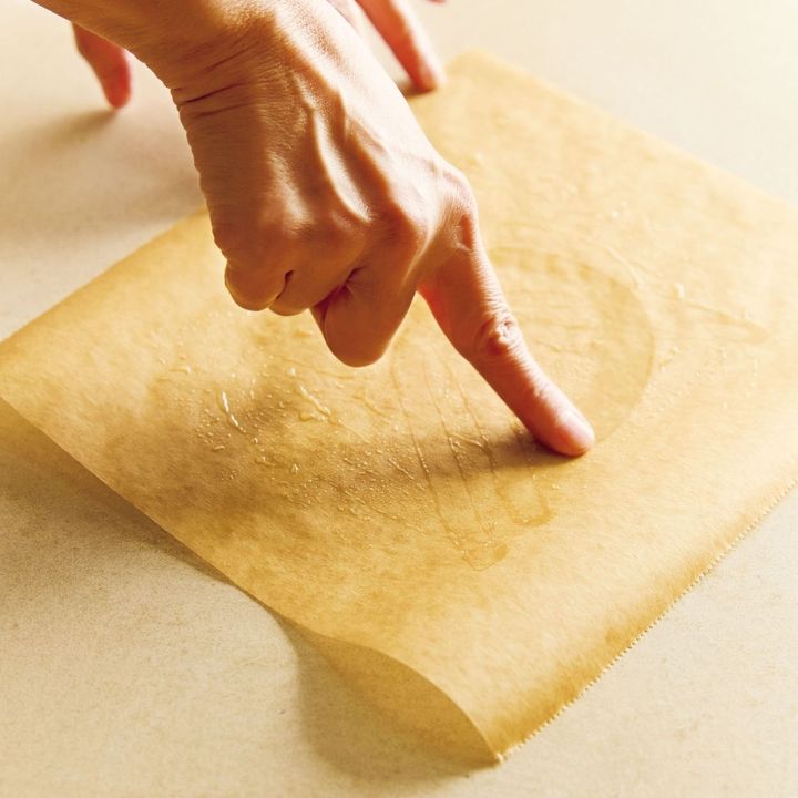 20×30cmのオーブン用シート全体に、植物油を指で薄く塗り広げ、バットに敷いておく。