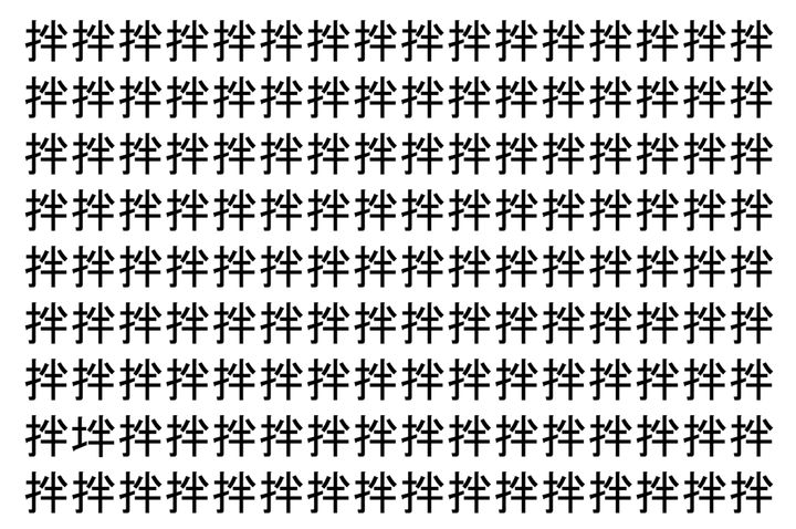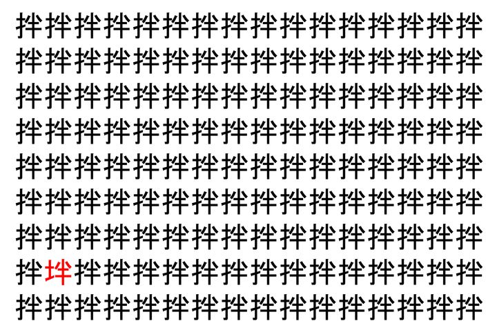 画像の中には、「拌」という漢字が縦に9行、横に16個並んでいます。 全部で144個となりますが・・・、そのうち1つは「異なる漢字」となってますよ!!