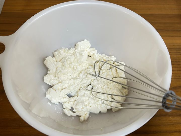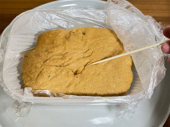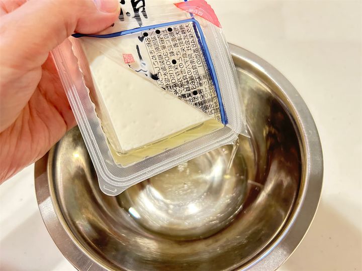 2.絹豆腐の水を捨てます。生地をなめらかに仕上げるために、豆腐は木綿豆腐ではなく、絹豆腐を使った方がいいそうです。