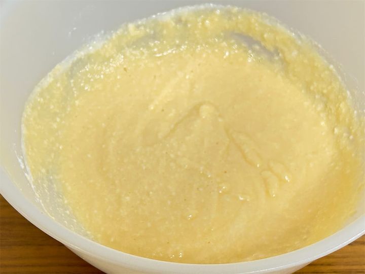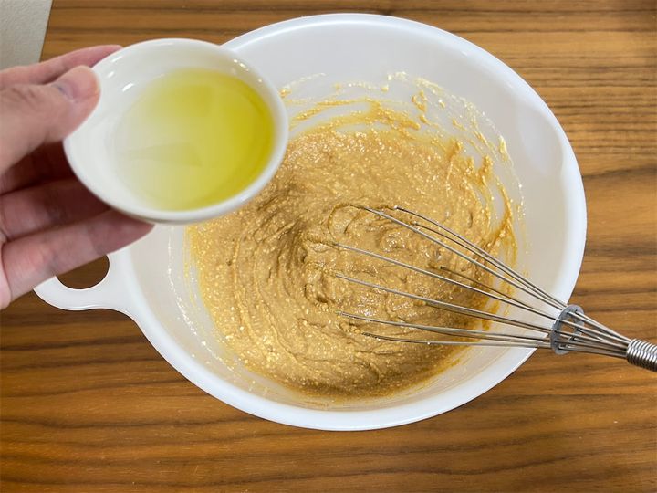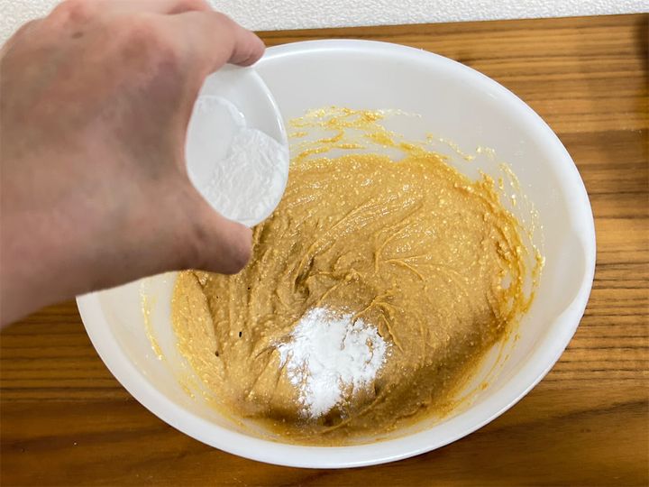 ベーキングパウダーを入れたら、あまり混ぜ過ぎないようにするのもポイントです。