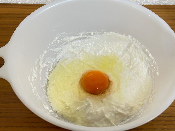3.2のペースト状にした豆腐に、卵を割り入れて混ぜていきます。