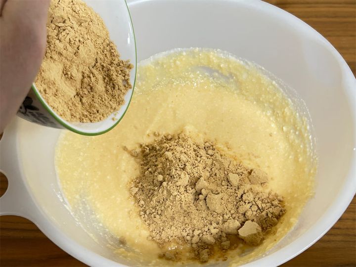 生地がしっとりしてきたところで、ベーキングパウダーを加えます。