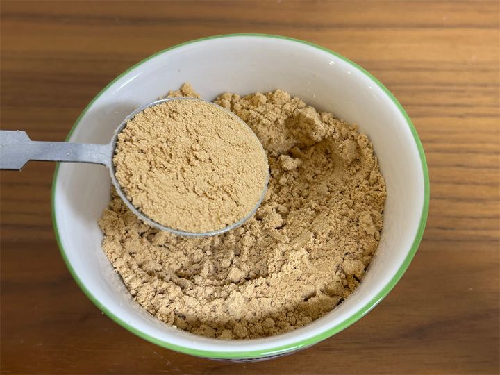 1.きな粉の分量を用意します。動画によると、大さじですり切り8杯程度とのことです。