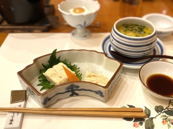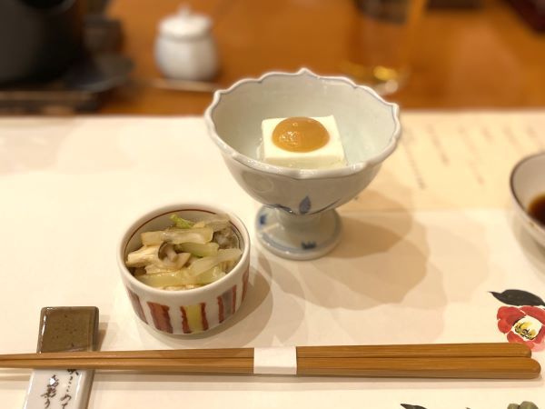 湯葉と豆腐を使った料理が特徴の同店、この日のコースは嶺岡豆腐と、とろ湯葉から始まりました。