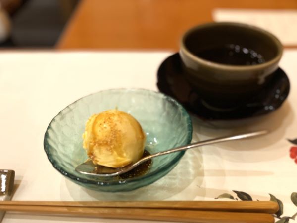 デザートのアイスクリームを熱々のお茶と一緒に。