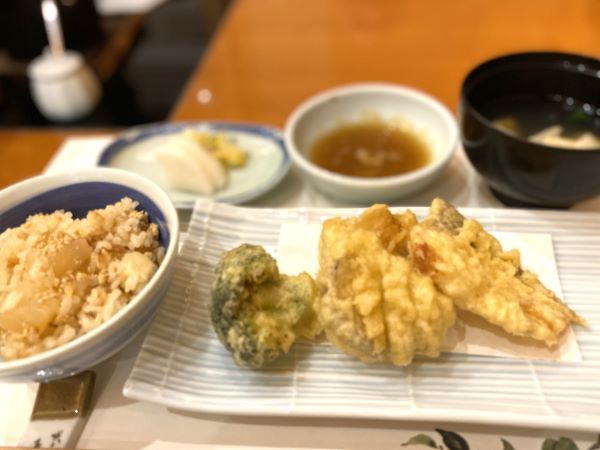 大根餅の天麩羅はもっちもちで美味、鰤もおいしかったです。大根と鶏そぼろの炊き込みご飯を、湯葉のお吸い物といただきました。