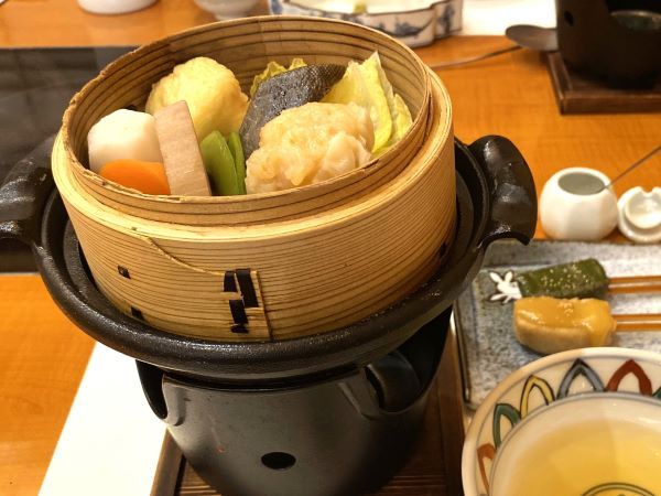 セイロの火が消え、ふたを開けると色とりどりの食材が詰まっていました。銀だら、えびづつみをはじめ、里芋やごぼうなどの野菜もたっぷり入っていました。