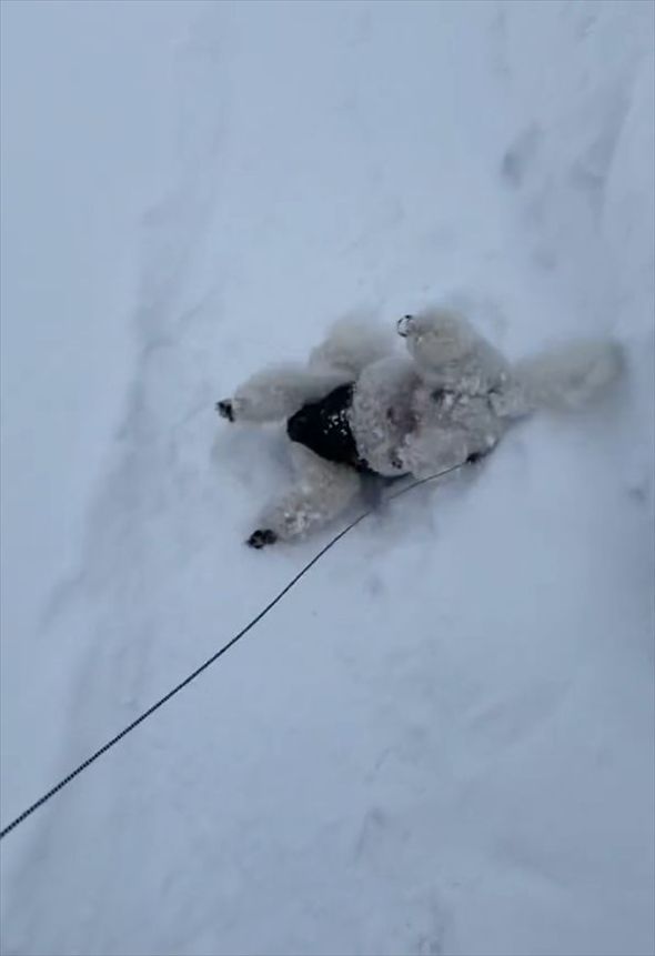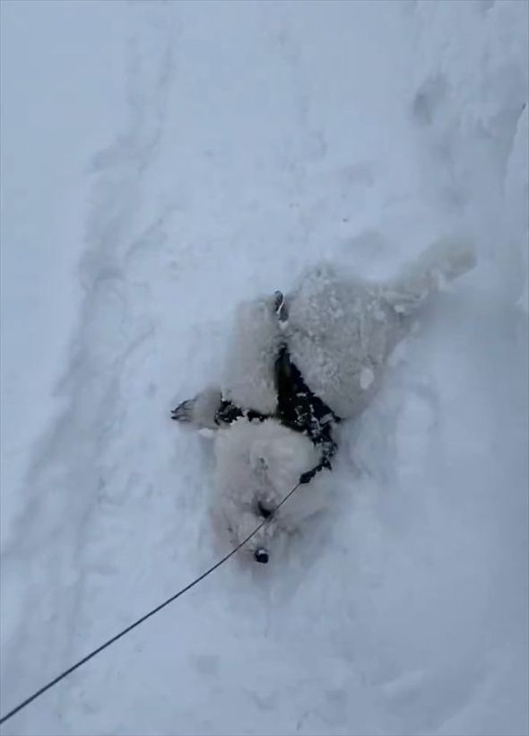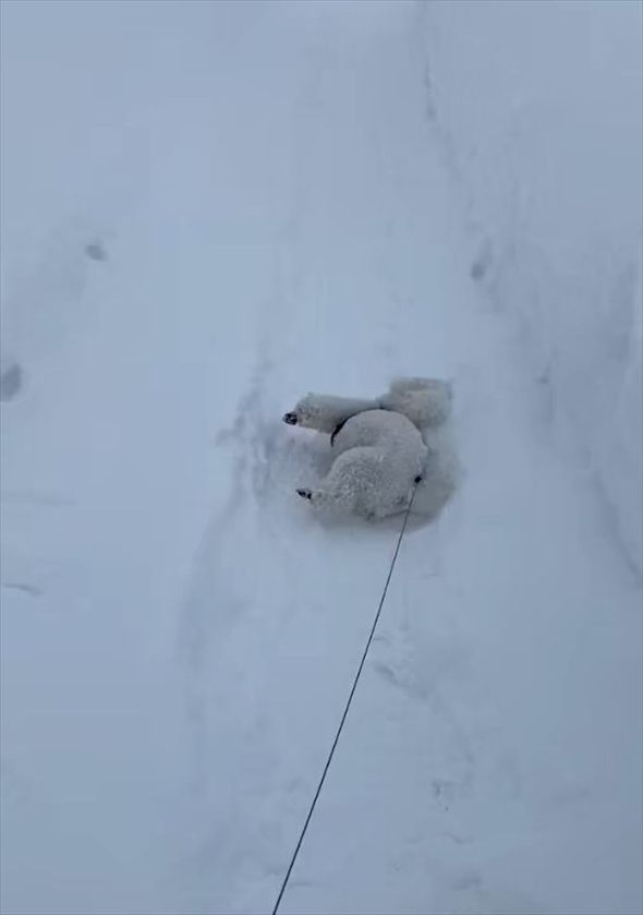 雪道の上を転がっているのは、おさんぽ中のビションフリーゼの『バニラ』くん。 視界いっぱいに積もっている雪にはしゃいでいるようです。