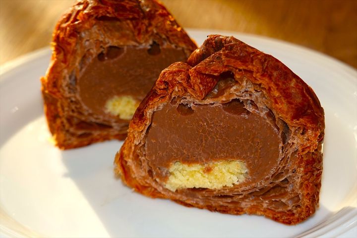 サクサクのクロワッサン生地の中に生チョコレート[オーレ]がたっぷりと入った「生チョコクロワッサン[オーレ]」。店舗で販売されているパンの中でも不動の人気を誇る逸品で、濃厚なチョコレートが食べ応えがあります。