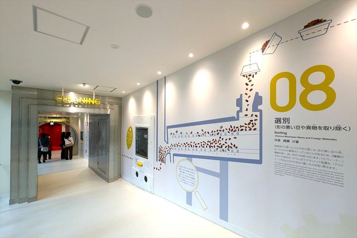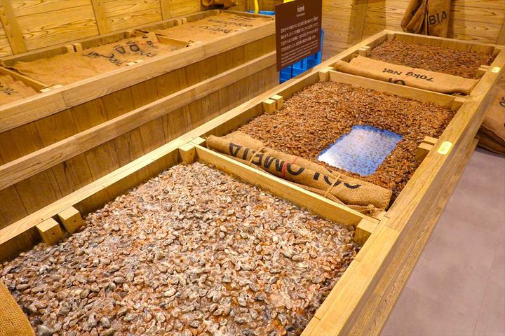 「カカオファームゾーン」から続くのは「工場体験ゾーン」。生産地から届いたカカオがチョコレート製品になるまでに行われる選別や洗浄、焙煎といった過程を追っていきます。