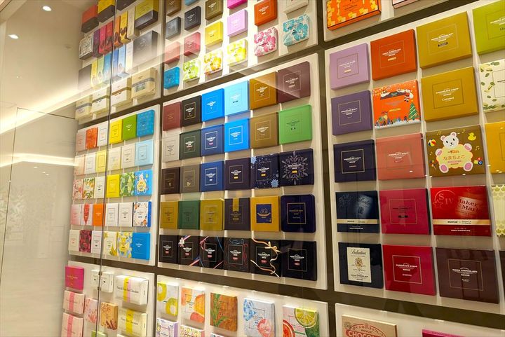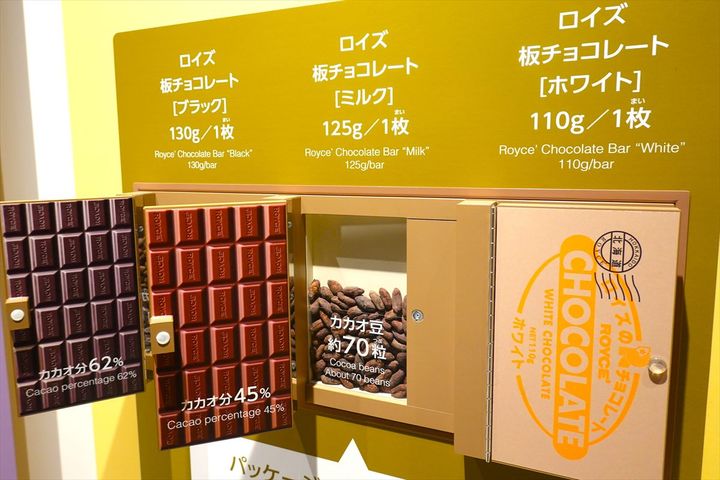 シンプルでありながら洗練されたデザインのパッケージがビシッと展示された光景は、もはや美術作品のような美しさ。ロイズが歩んできた40年以上の歴史を感じます。