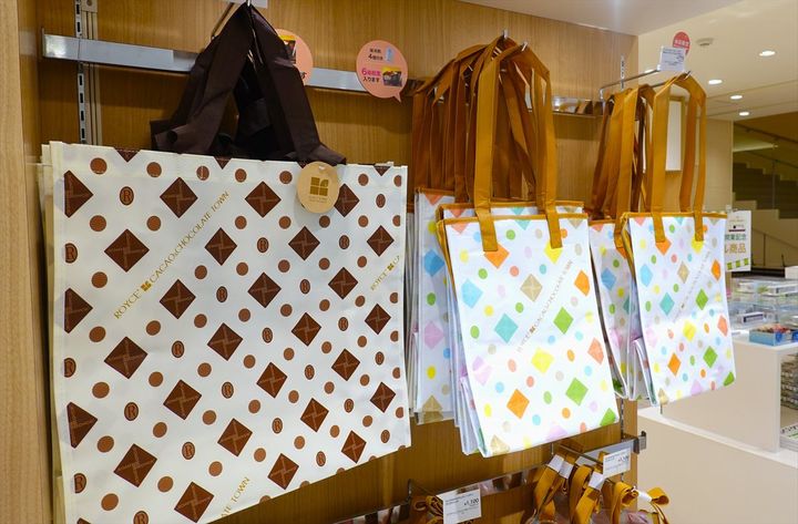 左:ロイズカカオ&チョコレートタウン ショッピングバッグ大(税込440円)右:ロイズカカオ&チョコレートタウン 保冷バッグ(チョコモノグラム)(税込770円)