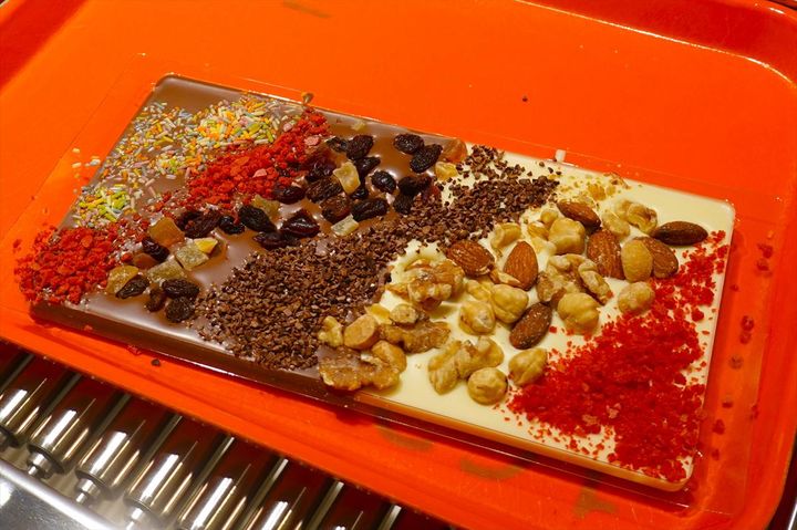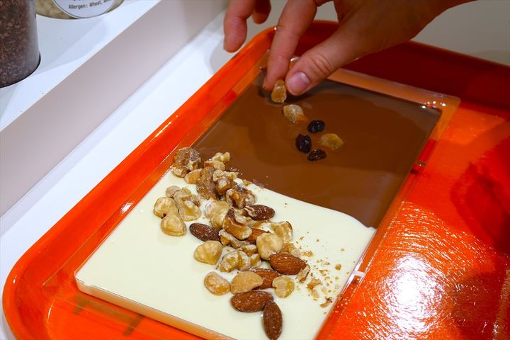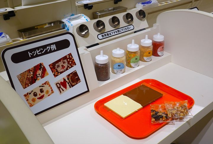 「チョコレートワークショップ」は、さまざまなトッピングを行い、オリジナルの板チョコレートを作成することができる人気のスポット。
