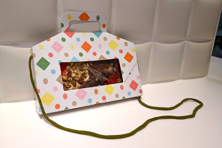 専用の持ち帰りの箱にチョコレートを入れて完成! 肩にかけられる紐が付いているので、持ち帰りやすいのがうれしいポイント◎