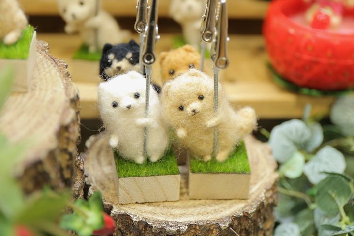 羊毛フェルトでワンちゃんを中心に製作。疲れた時に目が合い、癒される、そんな存在でいてくれたらという思いが込められています。