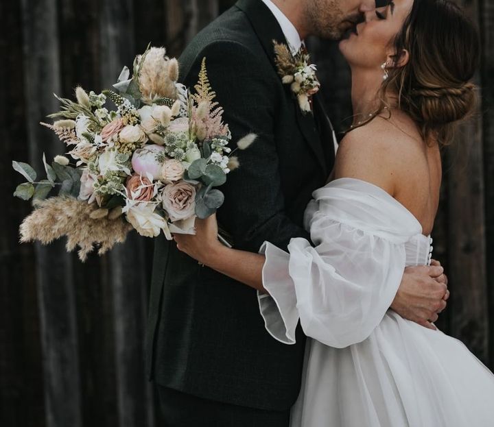 より自然で素朴な雰囲気を出したい場合は、キャラメル色の薔薇をドライフラワーやパンパスグラス、ブラウン、トープ、ベージュの葉物と組み合わせることで、リラックスしたナチュラル感のある美しさを演出できます。