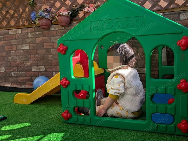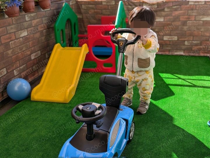 名付けて「家のベランダ公園化計画」。人口芝生と目隠し用の柵を取り付け、遊具を設置したここさんオリジナルの公園です。「パジャマで遊ばせられるところが良い」と語るここさん。外出用の服に着替えさせるひと手間がいらないのが、良いアイデアですね。