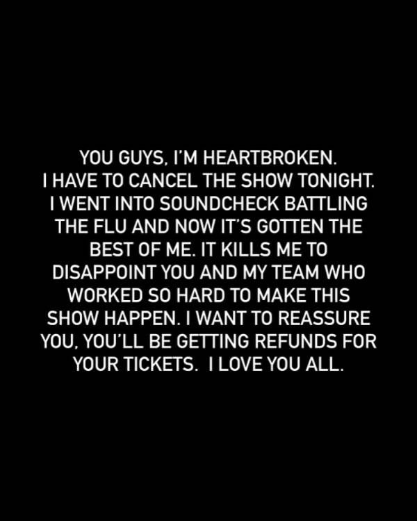 「今夜のショーをキャンセルしなければならないんだ。サウンドチェックのときからインフルエンザと闘っていたんだけど、完全にやられてしまったんだ」
