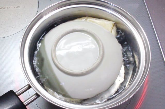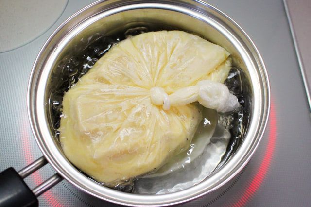 3. しっかりと空気を抜いて口を固く結び、沸騰したお湯に耐熱皿を敷いて2を入れ、ごく弱火で15分ほど茹でます。