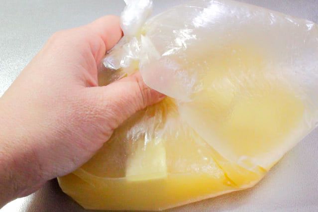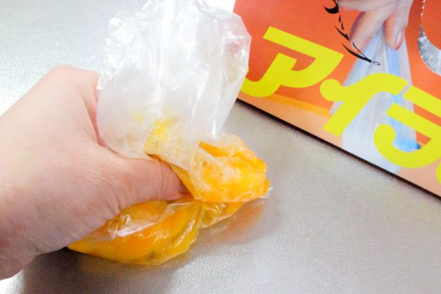 袋の上からやさしく揉んで白身と黄身を混ぜ合わせます。画像は片手で写っていますが、袋の口を軽く閉じて両手でこするようにして揉むと、簡単に混ざりました。