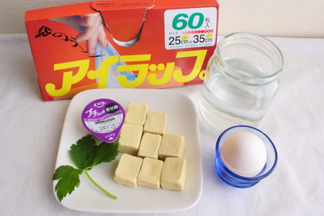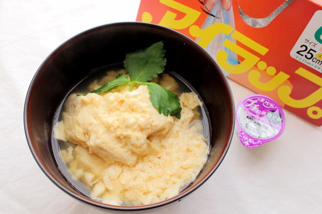 災害時レシピとして紹介していただけに、湯せん調理に使える耐熱性のポリエチレン袋が必須ですが、材料を入れて湯せんするだけで、なめらかな口どけの卵豆腐と、上品なだしのおいしさが染みた食べ応えのある高野豆腐を一度に味わえますよ。