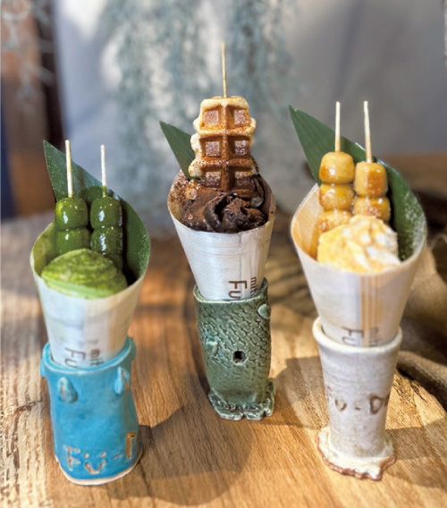 見た目もキュートな「生麩ワッフルパフェ」(中央)、「生麩みたらしパフェ」(左・右)(各700円)