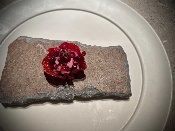 「美和馬と ビーツのタルト」ビーツのタルト生地の中に、馬肉とビーツが入った花のように美しいアミューズ。黒ニンニクのピューレがアクセントに。