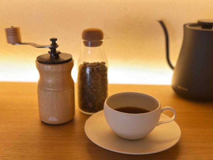 コーヒー豆とミルがお部屋に置いてあるのは珍しい。引き立ての美味しいコーヒーを部屋で飲めるのは嬉しい!
