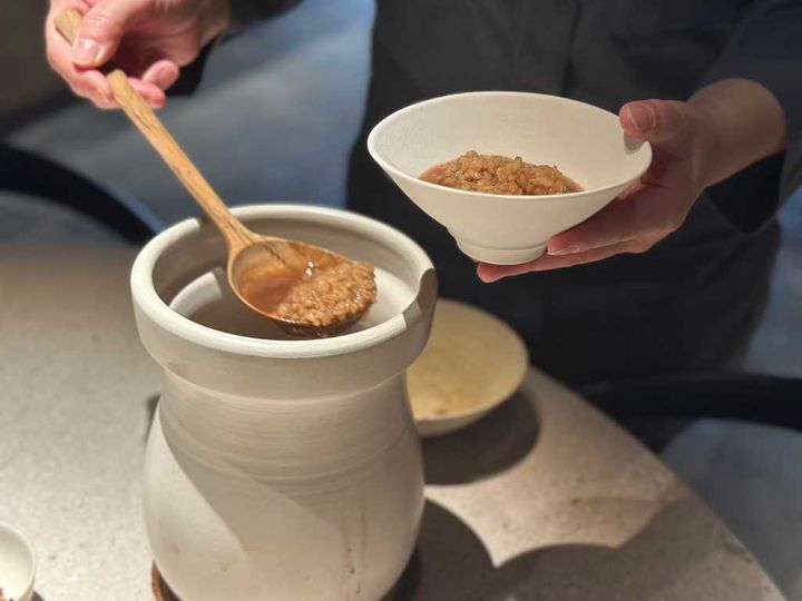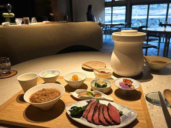 朝食は奈良の郷土料理「茶粥」をメインにした和食膳ですが、ここでも薪火が主役。メインの倭鴨は自家製の塩麹でマリネしたあと、薪火で燻して低温調理で仕上げられているので柔らかくジューシー。肉派の私には、焼き魚ではなく朝から“鴨肉”が出てきたのはとても喜ばしいこと!茶粥は前日のディナーで使用した肉や野菜などの端材で出汁をとったりと、朝からワクワクするような料理がテーブルを彩ります。