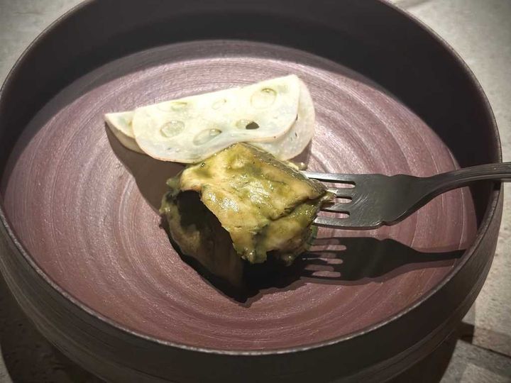 「薪火で焼き上げたアワビと蓮根餅」黒キャベツと肝ソースを添えて。