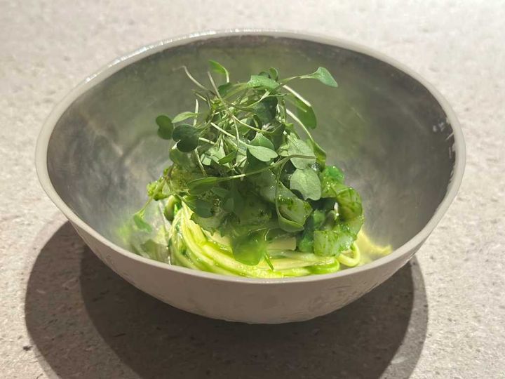「三輪手延べパスタ アオリイカ チーマディラーパ」手延べそうめんの技法で仕込んだパスタとアオリイカが絶妙な食感。チーマディラーパはイタリアの菜の花。自家製のキウイ酢でさっぱりした味わい。