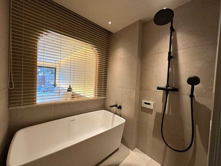 おしゃれな湯船はゆったり浸かれる大きさ。