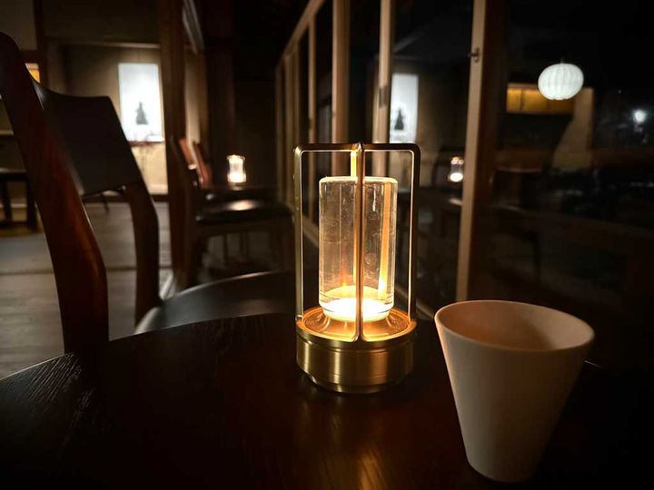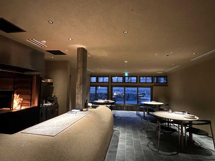 陽が落ちて、幻想的な夜のラウンジで食前の一杯を楽しむところから始まるディナーは、まるで物語の序章のよう。1組ずつ案内される特別感にちょっと緊張しながらメインダイニングへ進むと、薪火のあたたかなあかりに包まれ、緊張が一気にほぐれます。