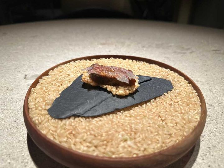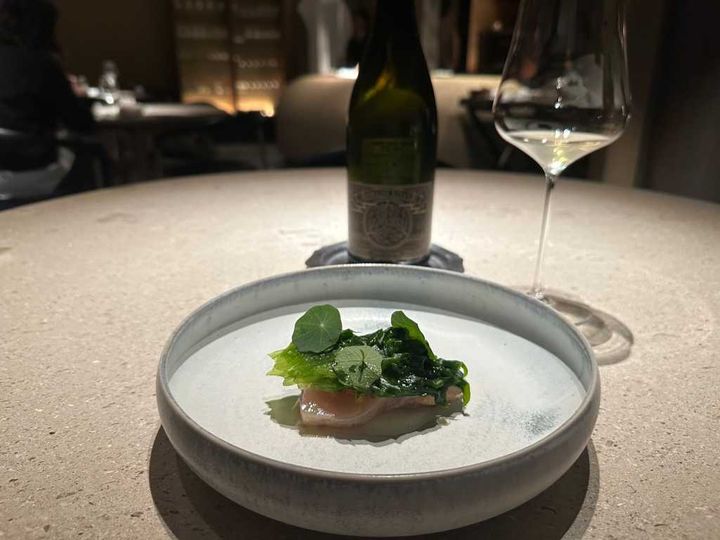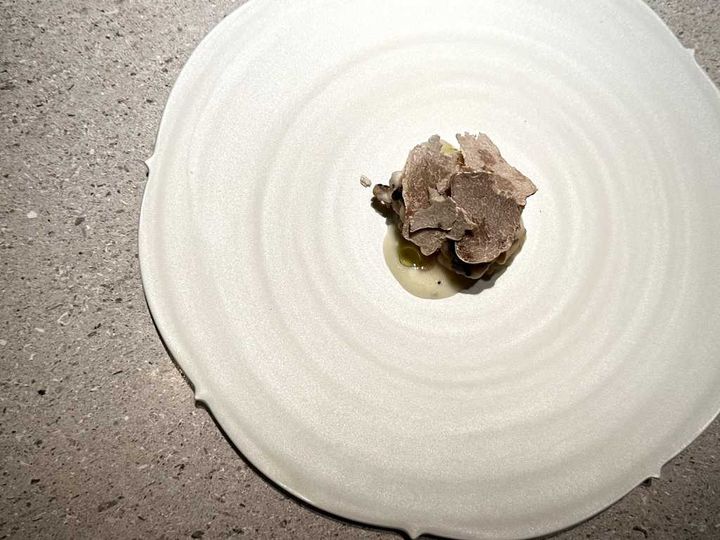「白トリュフ」と聞くとテンションが上がる私たち。クリーミーな雲子と、大和ネギの甘みをトリュフの香りが贅沢に包み込みます。自家製甘酒とシェーブルチーズのソースがまた意外なマリアージュ。