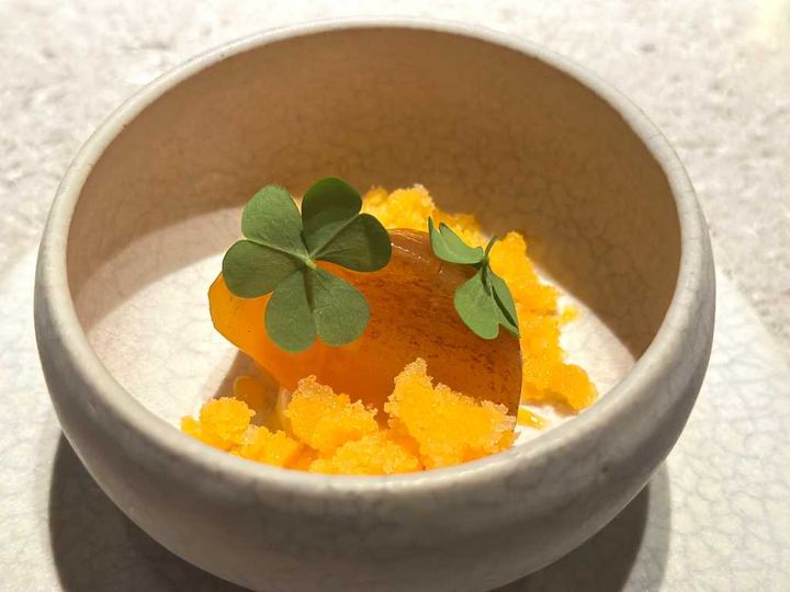 食後のデザートも一種類ではないのが感動!まずは「地元の柿と和歌山「藏光農園」のみかんのグラニテ」。金木犀の花を浸けたハチミツで香り付けされています。