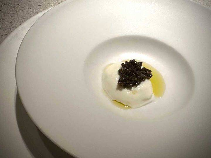 「生まれたてのモッツアレラとキャビア」植村牧場の牛乳を使った作りたての自家製モッツァレラとスモークした昆布締めキャビア。シグニチャーメニューの一つなだけあり、コクがあって本当に美味しい。