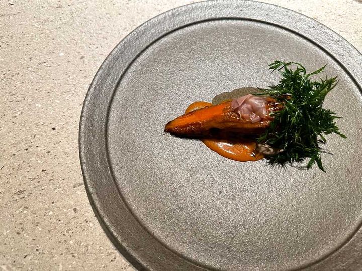 「harasawa FARM」の人参。一本そのままのビジュアルがなんとも可愛い。ローストしたあと、半日かけてオーブンで低温調理しているそう。手が混んでいます。レバームースと薔薇の香りのビネガーを添えて。