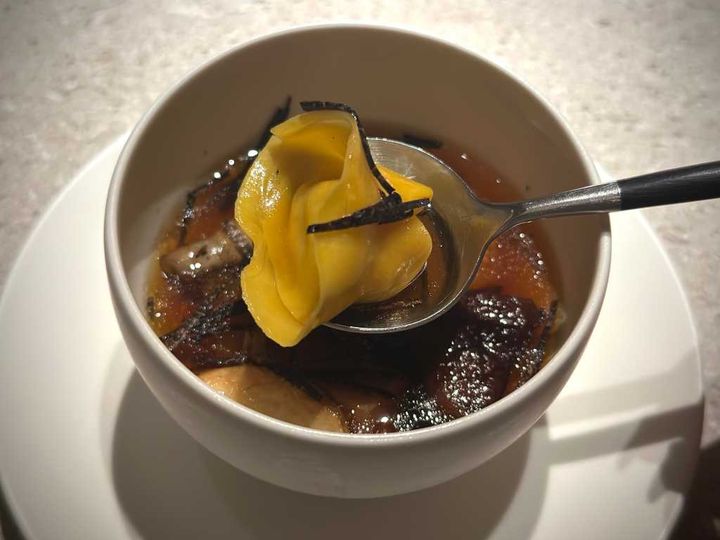 「倭鴨のコンソメとトルテッリ」トルテッリは北イタリアのパスタでラヴィオリのこと。中には里芋のペーストが入っていて滑らかな食感。倭鴨のコンソメには薪火で調理したムカゴやゴボウ、椎茸と具沢山。
