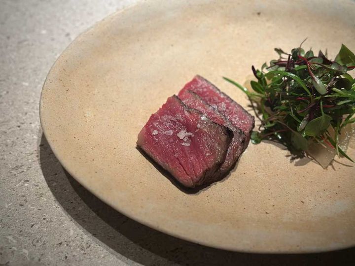 「サカエヤ 新保さんが手当した経産黒毛和牛サーロイン」薪火の香りが口に中に広がります。弾力がありとても柔らかい赤身肉。ここであえて脂の乗った霜降り肉ではなく、旨みの乗った赤身肉にしているのもさすが。「お肉は別腹」という感じにぺろっと美味しくいただけました。