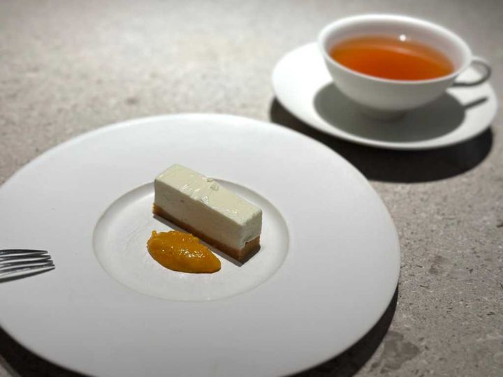 食後のデザートは自家製レアチーズケーキ。和歌山「藏光農園」の由良早生みかんのソースがよく合います。