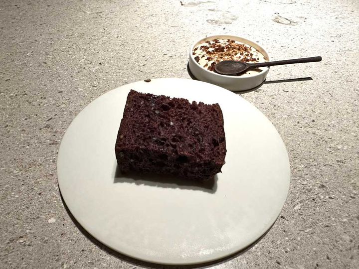 奈良の古代米を使った自家製パンは香ばしくて歯応えもあって美味しい。奈良の醤油蔵のお味噌のエスプーマをディップしていただきます。