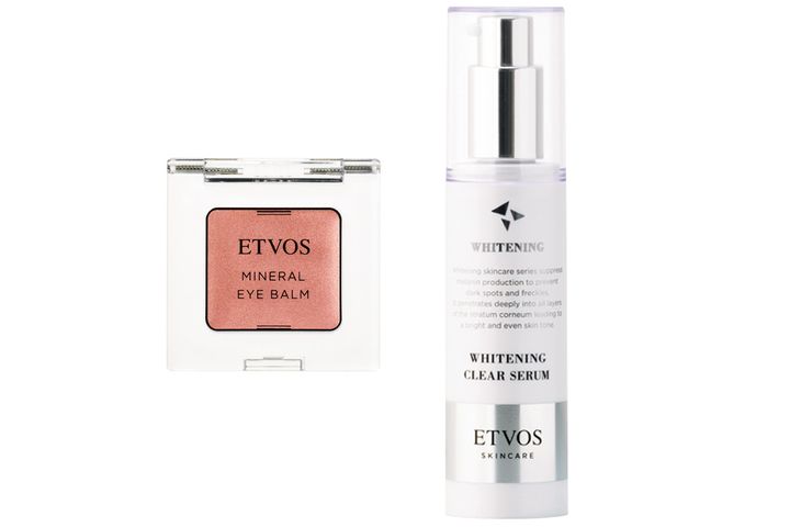 (左)潤いとフィット感、より美発色に。ミネラルアイバーム #ピンクフィズ ¥2,750(右)1本で美容液+乳液の2役、美白と保湿ケアが叶う。薬用 ホワイトニングクリアセラムW [医薬部外品]50ml ¥5,940 (ともにエトヴォス)