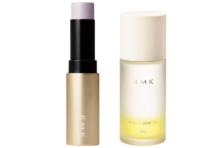 (左)チーク、ハイライト、目元にも使える万能スティック。ラディアントカラースティック 01 ¥3,630(右)RMKで大人気のプレケア美容液で肌力強化。Wトリートメントオイル 50ml ¥4,400(ともにRMK Division)