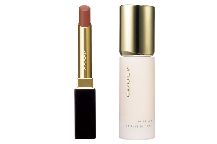 (左)高発色でベルベットのような艷が肌を美しく魅せる。ベルベット フィット リップスティック 02 香木 -KOUBOKU ¥5,830(1/24発売)(右)高貴な艶を演出。ザ プライマー SPF15・PA+ 30g ¥11,000(ともにSUQQU)