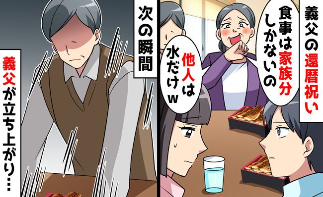 義父の還暦祝いで嫁は水だけ!義母「食事は家族分だけよ」妊娠しない私を他人扱いする義母に、義父が!